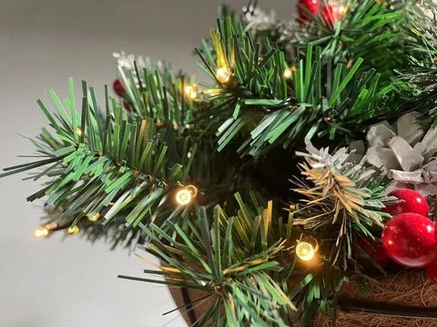 - BUILT-IN LIGHTING: Trimmed with red berries, pine cones, snow and 50 Battery-operated UL white LED lights with integrated 6 hours On/18 hours Off timer.